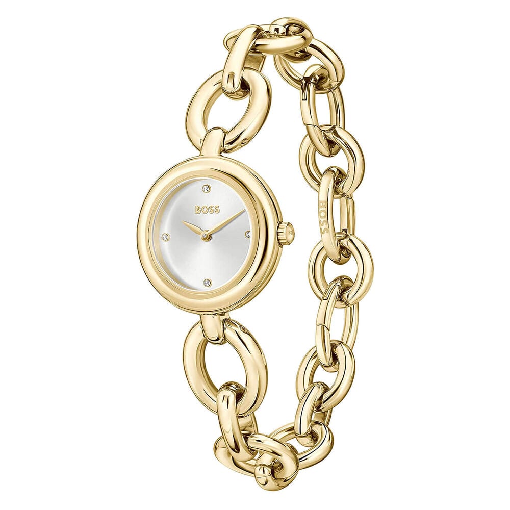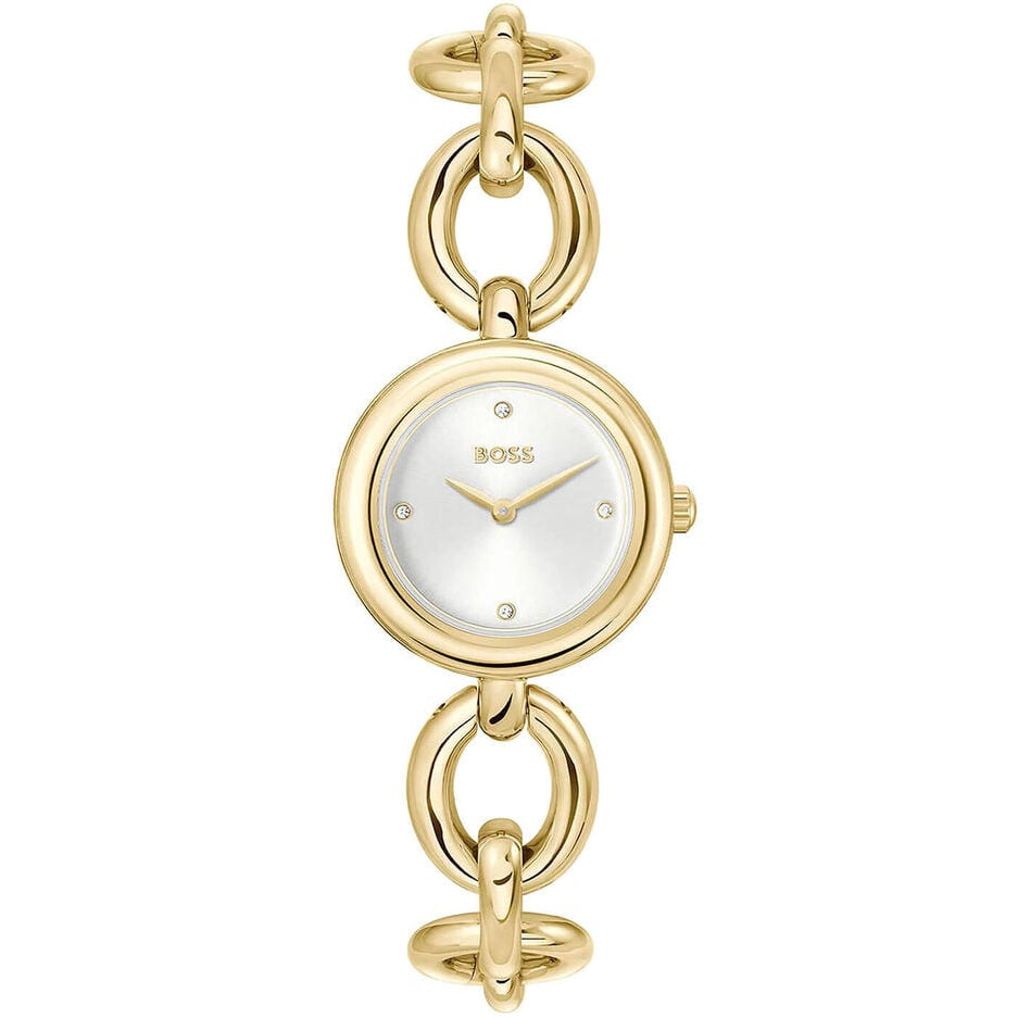 Showcasing a luminous gold-tone stainless steel case and bracelet, this watch embodies both luxury and adaptability. Its minimalist dial, detailed with subtle hour markers and elegant hands, underscores a polished and sophisticated style. Driven by an accurate quartz movement, it offers dependable timekeeping. An ideal accessory to elevate everyday looks or special events, this watch makes a distinguished statement with any ensemble.