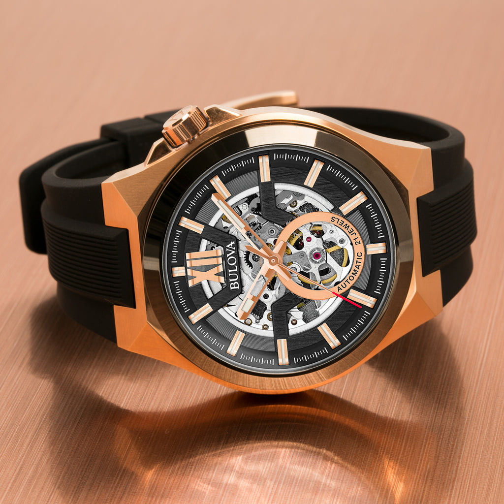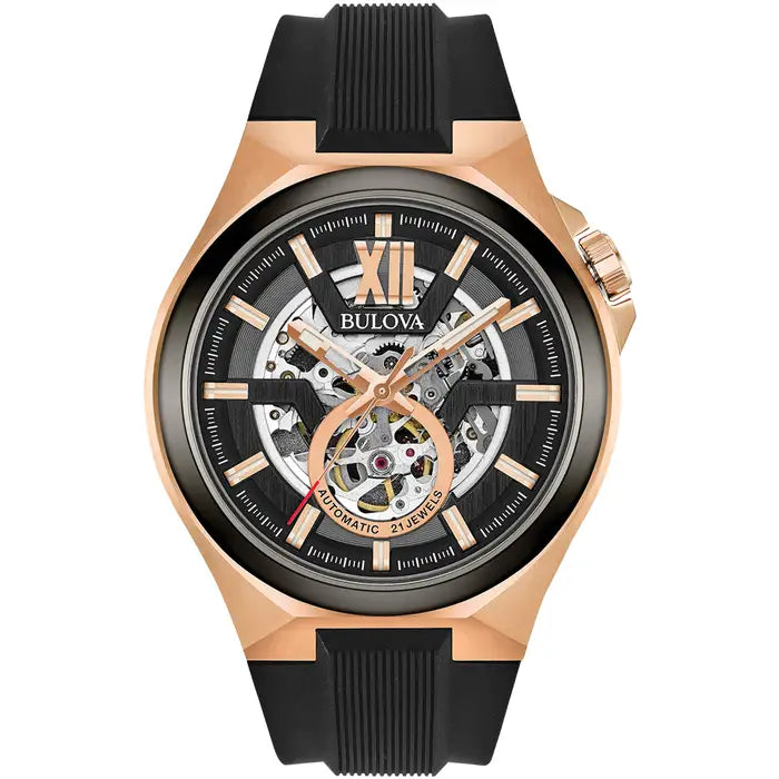 Bulova Maquina Men's Watch Rose Gold Black Skeleton 98A177