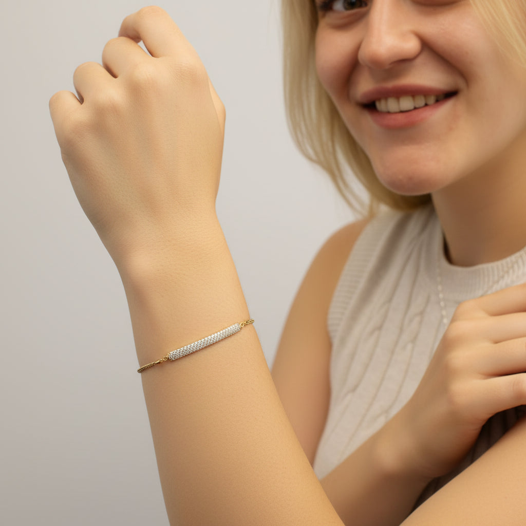 Elevate your style with our Diamond Pavé Chain Slider Bracelet! This stunning slider bracelet features 180 degrees of sparkling pave diamonds, adding a touch of elegance to any outfit. Slide it on and feel the confidence radiate as you stand out from the crowd. Make a statement with this must-have accessory!