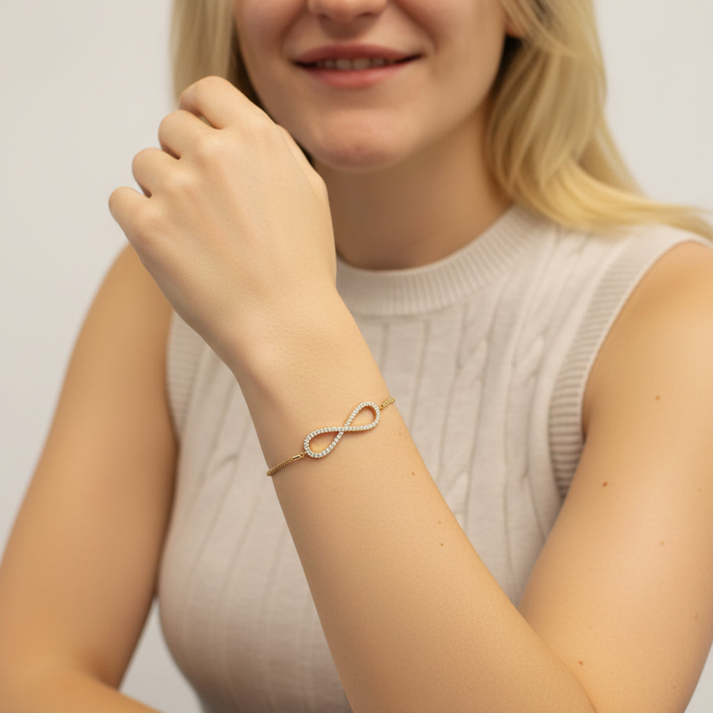 Elevate your style with our Diamond Pavé Infinity Chain Slider Bracelet! The infinity pave set centre adds a touch of elegance, while the slider bracelet allows for an adjustable and comfortable fit. Perfect for any occasion, add a touch of sparkle and sophistication to your look.