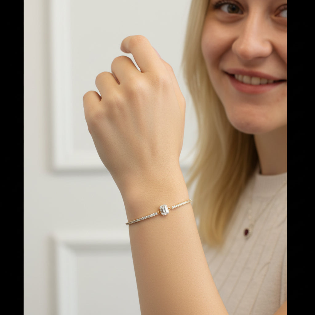 This playful Emerald Diamond Pavé Bar Bracelet features a dazzling emerald cut diamond centre, complemented by a sparkling pave diamond bangle. Impress with the unique combination of elegance and charm.