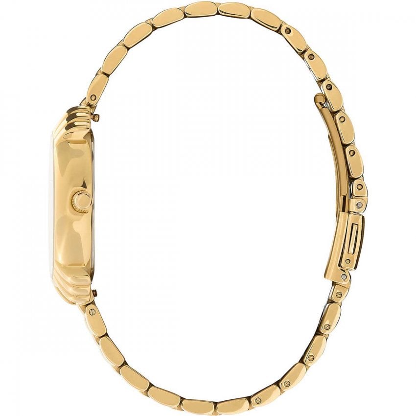 Drawing inspiration from the Art Deco era, this elegant gold watch captures the spirit of the roaring twenties. Its stunning emerald-green dial features a mother-of-pearl finish adorned with exquisite baguette crystal markers that shimmer gracefully. The case echoes Art Deco architectural elements with refined geometric fan detailing, complemented by a contemporary bracelet strap. A truly sophisticated accessory, it’s the perfect statement piece for any special occasion.