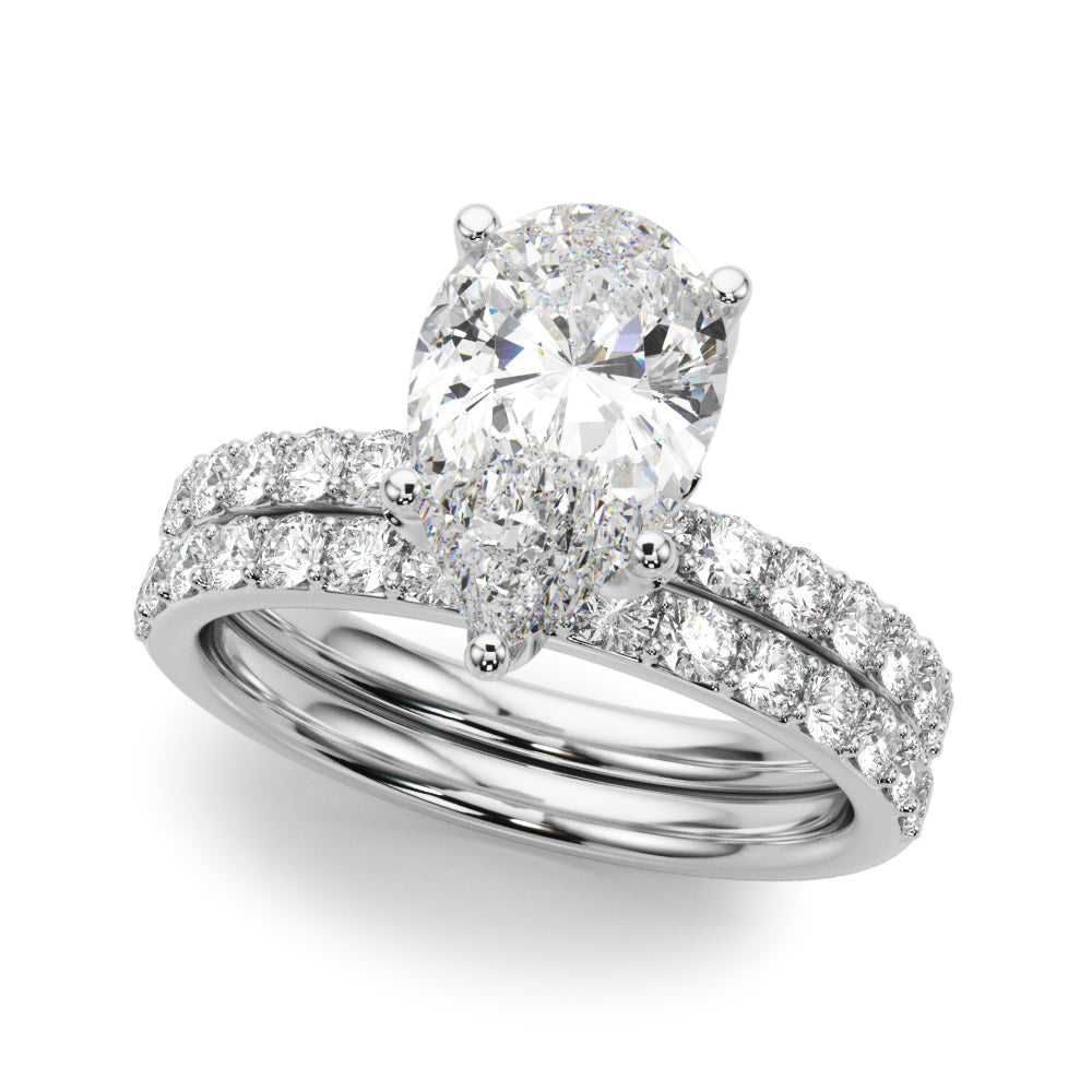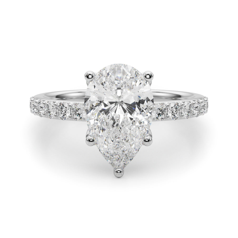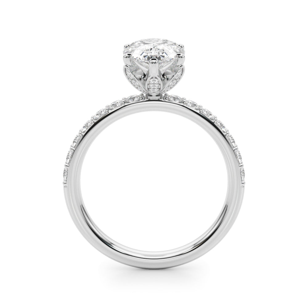 Enjoy the floral look of our Pear Pavé Engagement Ring. The diamond set shoulders and single solitaire setting with under floral setting exude luxury, while also symbolising past, present, and future love.