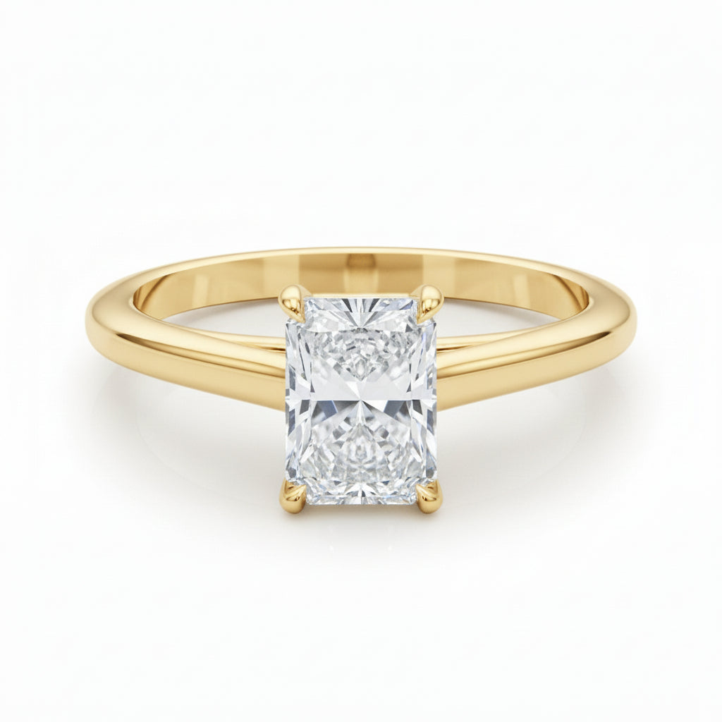 Elevate your love with the Radiant Solitaire Engagement Ring. Featuring a stunning 4 claw set Radiant cut lab-grown diamond and crossover-like head setting, this single stone ring is a symbol of timeless elegance and sophistication. Perfect for the one-of-a-kind love story you and your partner share.