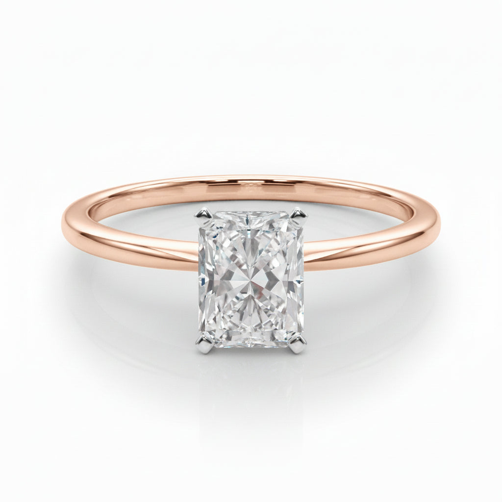 Elevate your love with the Radiant Solitaire Engagement Ring. Featuring a stunning 4 claw set Radiant cut lab-grown diamond and Tulip-like head setting, this single stone ring is a symbol of timeless elegance and sophistication. Perfect for the one-of-a-kind love story you and your partner share.