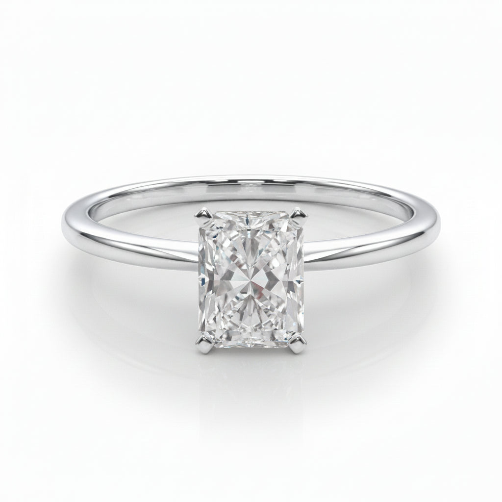 Elevate your love with the Radiant Solitaire Engagement Ring. Featuring a stunning 4 claw set Radiant cut lab-grown diamond and Tulip-like head setting, this single stone ring is a symbol of timeless elegance and sophistication. Perfect for the one-of-a-kind love story you and your partner share.