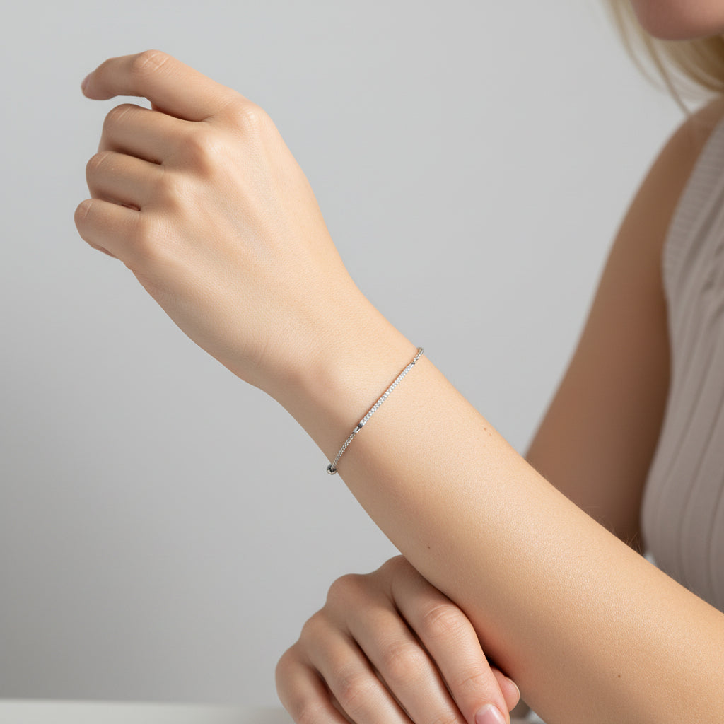 This brilliant Round Diamond Chain Slider Bracelet features a dazzling pave centre bar that adds a touch of sparkle and charm to any outfit. The adjustable slider bracelet ensures a perfect fit for all, making it a versatile and stylish accessory for any occasion. Show off your sophisticated and elegant side with this must-have piece!