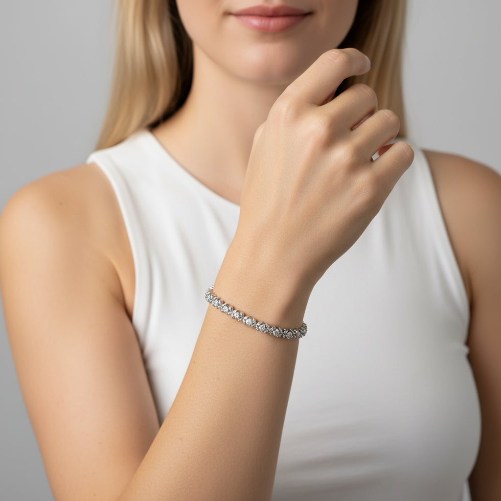 Floral elegance meets timeless sparkle with our Round Diamond Floral XO Bracelet. Adorned with round cut diamonds in a charming XO pattern, this bracelet adds a touch of romance to any outfit. Perfect for special occasions or everyday wear, it's a must-have accessory for those who appreciate both beauty and brilliance