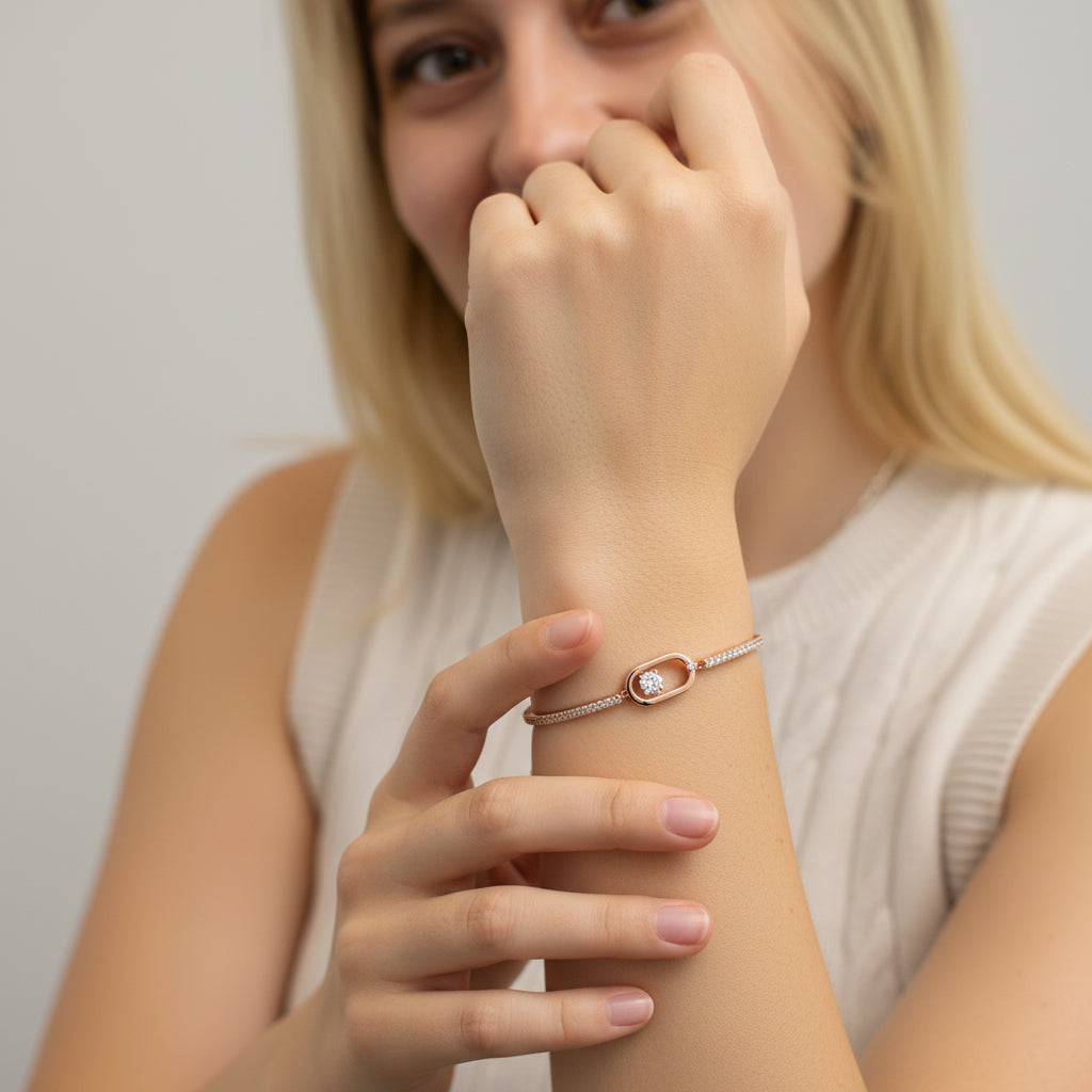 Upgrade your jewellery game with this Round Diamond Hoop Set Bar Bangle. It boasts an elegant oval hoop design with a sparkling diamond centre, adding a touch of luxury to any outfit. Upgrade your style with this unique and chic accessory.