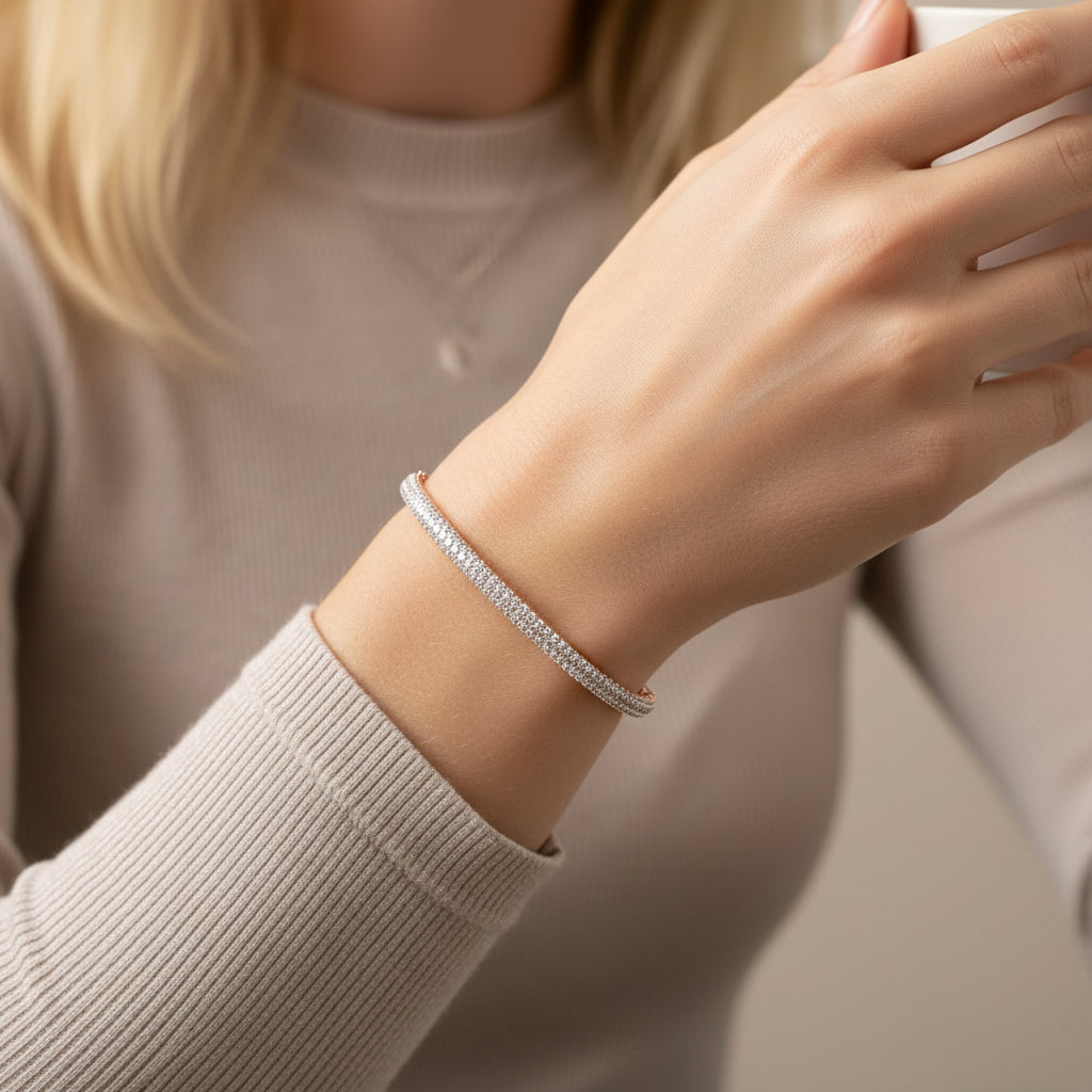 Experience ultimate elegance and luxury with our Round Diamond Pavé Bangle. Adorned with pave diamonds, this bangle offers 180 degree coverage for a truly stunning and radiant look. Elevate any outfit and indulge in the dazzling beauty of this must-have accessory.