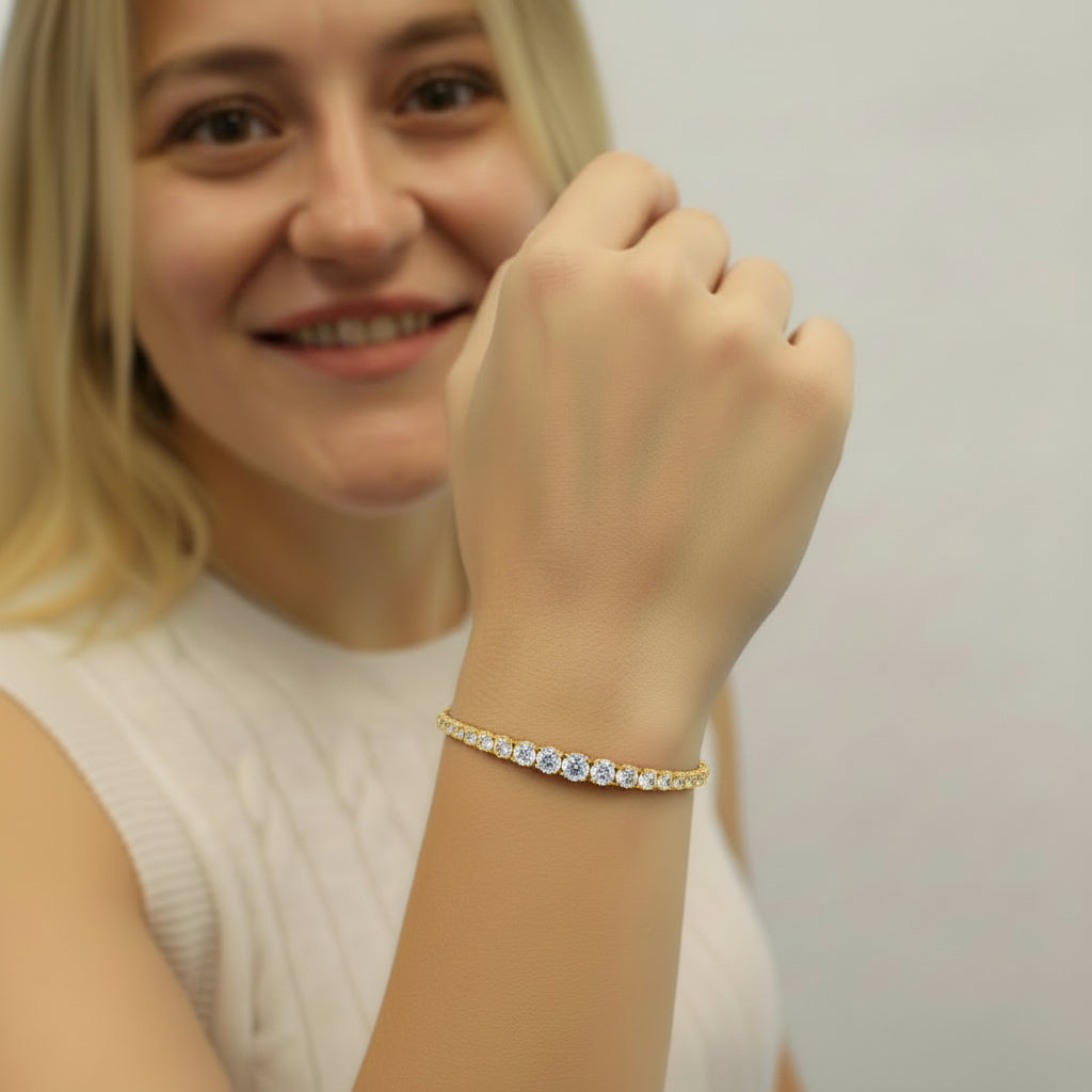 Experience the ultimate in luxury with our Round Diamond Progressive Tennis Bracelet. Each intricate link features a stunning round diamond, creating a dynamic and sophisticated design. Elevate any outfit with this exclusive and timeless piece.