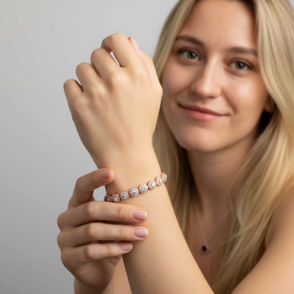 Give your wrist a touch of elegance with our Round Halo Diamond Tennis Bracelet. This classic piece features a halo design with sparkling diamonds, adding a touch of brilliance to any outfit. Perfect for any occasion, this bracelet will be sure to catch everyone's eye and make you feel like a true fashionista.
