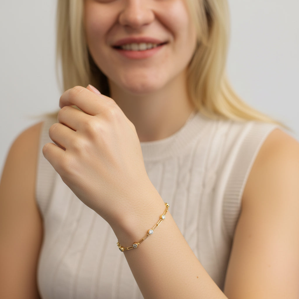 This round rub over diamond paperclip bracelet effortlessly combines simplicity and elegance, making it the perfect accessory to make a statement. The classic design and sparkling diamonds add a touch of sophistication to any outfit. Elevate your style with this must-have bracelet.
